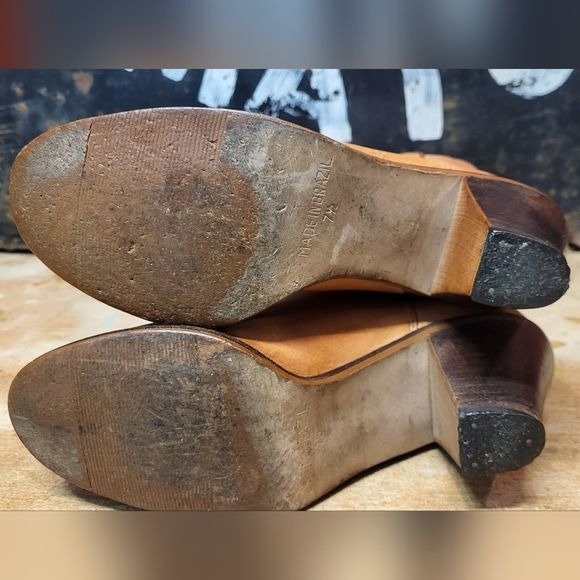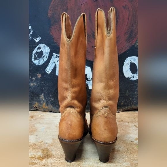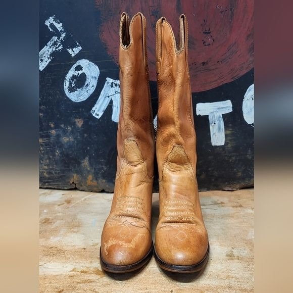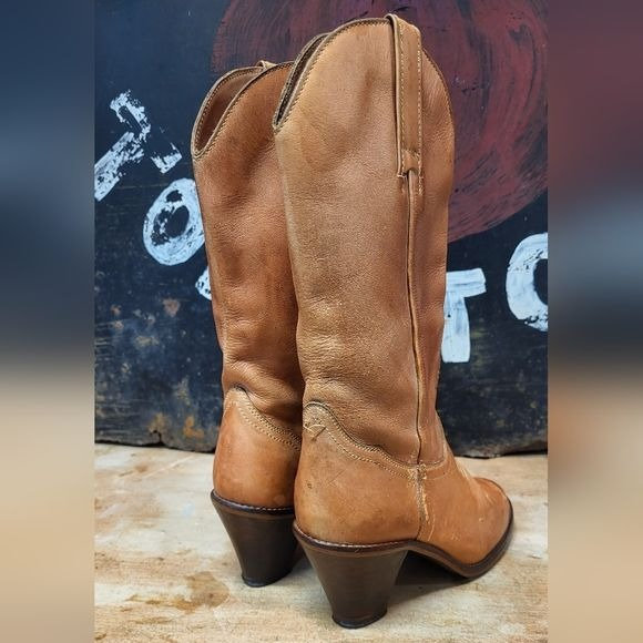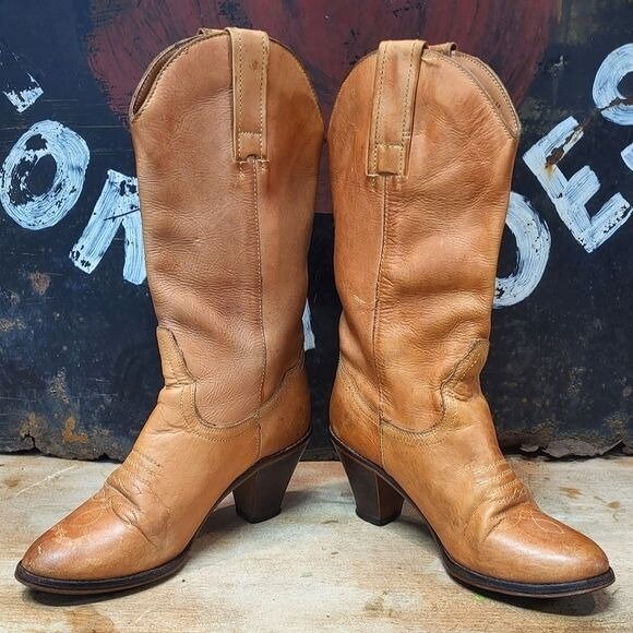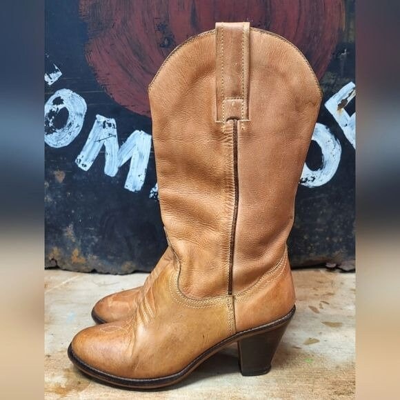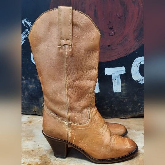 Cute vintage 60s/70s woman's tan leather western boots. Very nicely made 2.75" stacked heel boots. Has that classic simple western boot in a nice medium tan brown. Soft leather with some distress. Has some marks on toe as pictured. Some other scuffs and dings that add some character to these vintage boots. Soles have some wear but plenty of life in them. Well made and nice quality. No brand found, markings worn off inside sole. Made in Brazil Size 7.5 Height 13.5" Heel height 2.75" Width 3.25" Heel to toe 8¾" Around calf top 13.5"