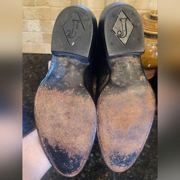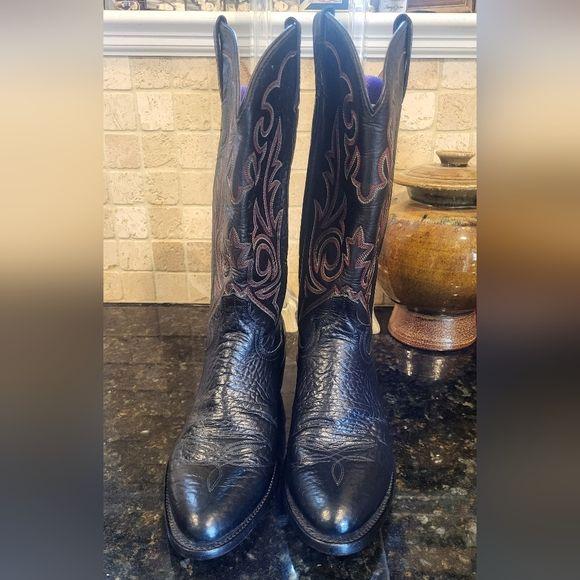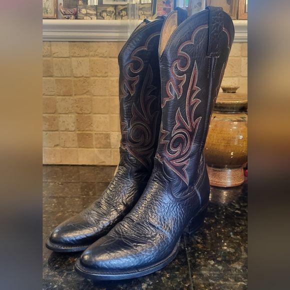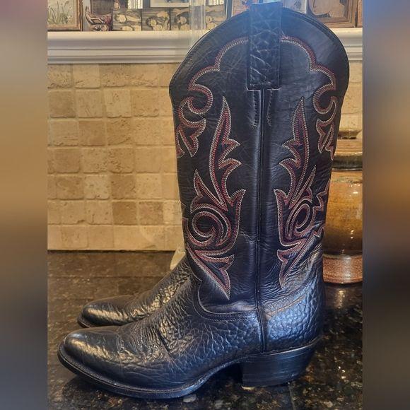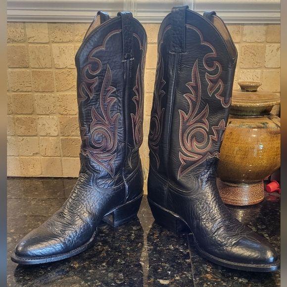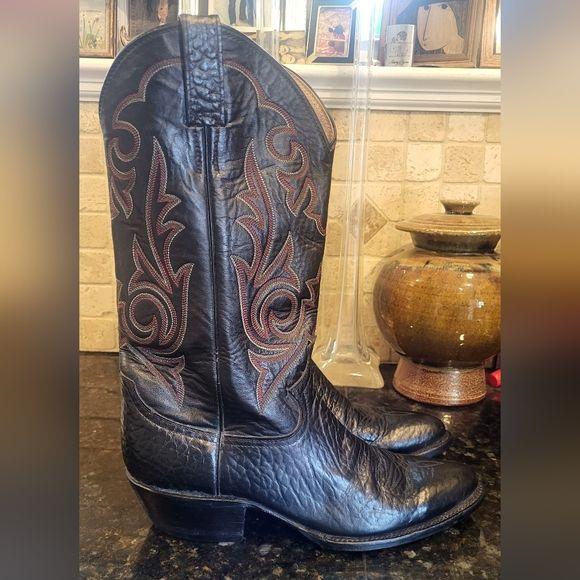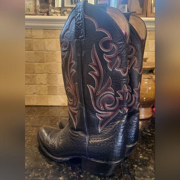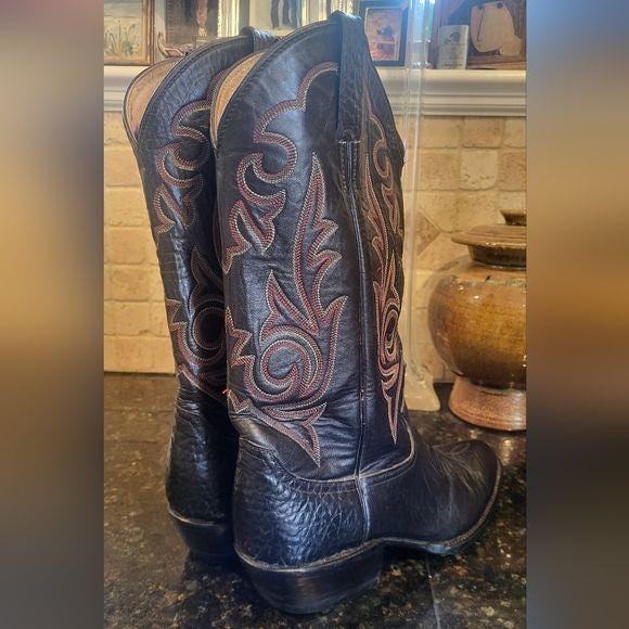 Justin Boots Diamond J black leather with red & white stitching western cowboy boots. Great textured leather on lower. Wonderful Justin boot quality and feel. Has a pointed rounded toe. Great shape with few minor scuffs and dings from wear. Soles have lots of life in them. Insides nice and clean. Only worn a handful of times. Men's size 8.5M Made in Mexico Heel to toe 10⅞" Width 3¾" Heel height 1⅞" Boot height 14¼" Around calf 14¼"